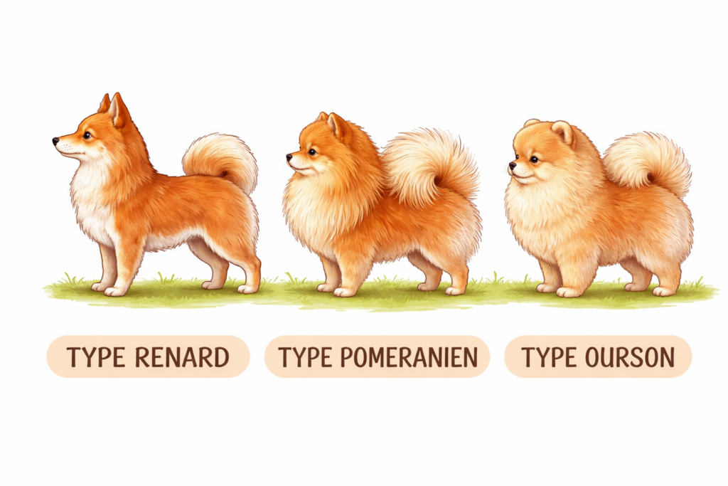 Ces types ne sont pas des races ni des catégories officielles. Ce sont seulement des descriptions esthétiques utilisées pour décrire la forme de la tête, le port des oreilles ou encore l’abondance du poil. Tous ces types restent des Spitz Allemands.